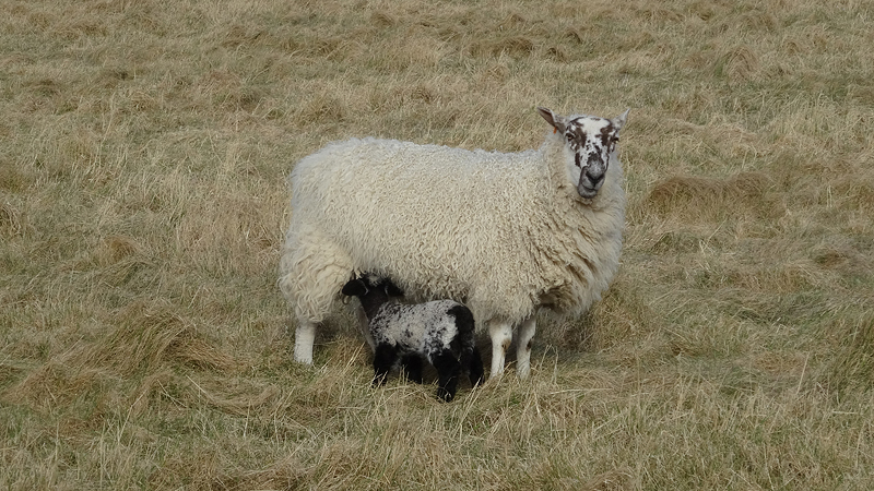 Het is nog best een stukje naar het castle en even verderop zie ik een ouder lammetje drinken bij de moeder. Leuk gezicht en ik verheug me al op de rest van het eiland want er is altijd wel wat te zien.
