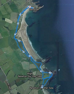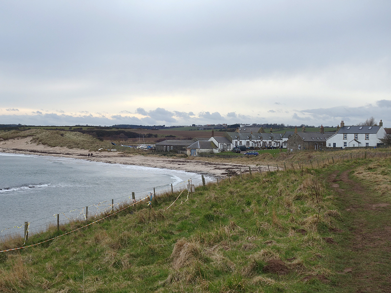 Bij Low Newton maak ik een foto van de zendmast waar ik steeds onder langs loop en daarna nog een foto van Low Newton uit de verte. Het blijft leuk om naar te kijken zo vanuit de verte en de hoger gelegen kliffen. Vorig jaar liep ik hier vaak met keiharde wind en ben ik wel eens een andere weg gelopen vanwege die harde wind. Behalve de forse echte stormen, is het qua wind eigenlijk heel rustig dit jaar.