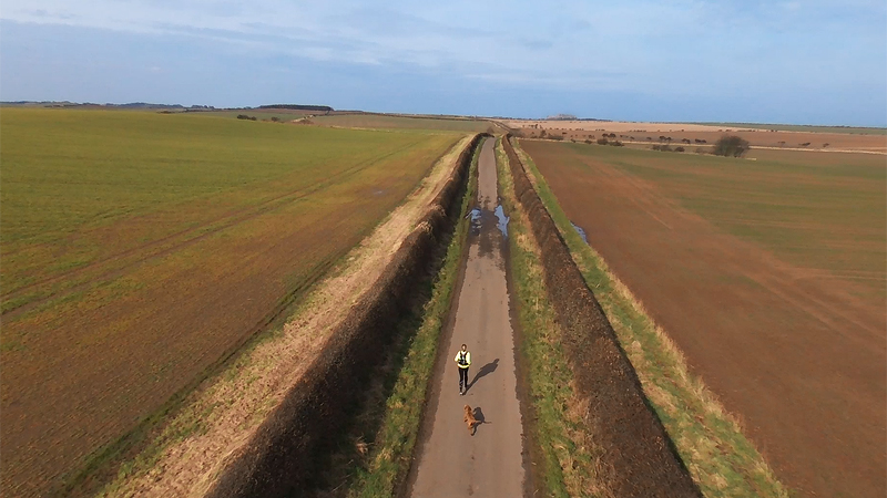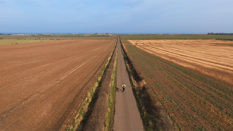 We lopen rustig door naar Elford en daar laat ik de drone weer op. Propellers erop, kalibreren, plan en gaan. Het kost wel tijd maar het gaat al sneller dan de vorige keer. En even later bij de skischans doe ik het nogmaals. Grappig genoeg lijken de foto’s dus op elkaar omdat je alleen de weg ziet met een geel poppetje. Op de eerste foto loop ik richting Bamburgh castle (het is de weg van foto 5), op de rechter foto loop ik richting de Farne Islands. Wij kunnen dat met onze ogen wel prima zien.