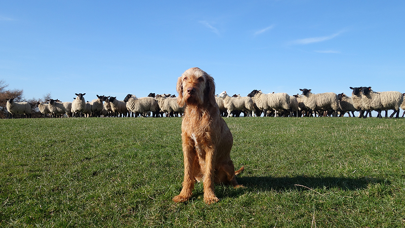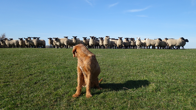 < Als ik wat foto’s sta te maken, staan de schapen ineens achter me. Woef kijkt ook verrast om. Die blik van woef…