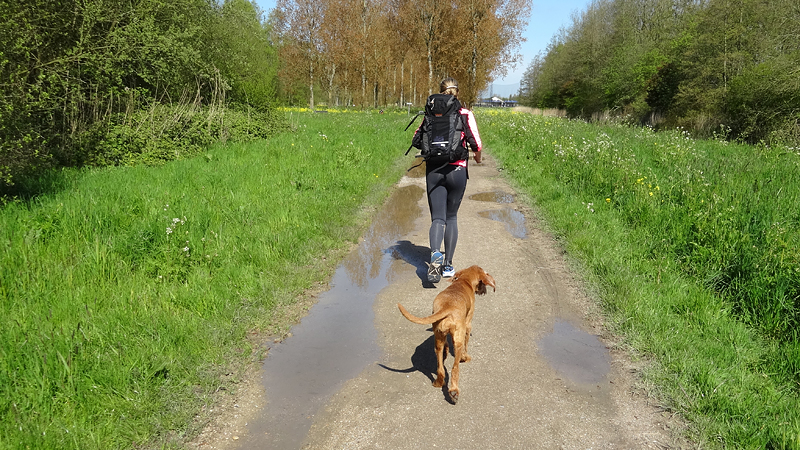 Gisteren hebben we voor het eerst een ‘echt’ fietstochtje van 44 km gedaan en kwam het niet meer van lopen. Een rustdagje qua lopen is natuurlijk geen probleem en zo vertrokken we vandaag dan weer voor een run. Ook vandaag weer een experiment. Ik had deze keer de grote Millet rugzak gevuld met wat spulletjes. Dat is geen minimalistische rugzak zoals de OMM (55L) maar een grote trekkers rugzak (65L) die veel kan hebben maar misschien wel comfortabeler zit met vol gewicht erin. Het eerste stuk liep ik dus met die zak, het tweede deel liep ik met de OMM zak om het verschil te kunnen voelen. Woef hoefde niet, want zij had de vorige keer totaal geen last van het rugzakje. Als ik met de Millet zou kunnen joggen, dan zou zij eventueel helemaal niets mee hoeven dragen (want er kan veel meer in de Millet).