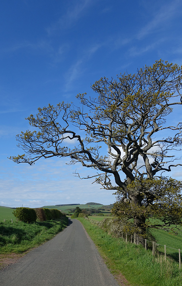 Daarna hobbelden woef en ik weer naar boven langs een omgeploegd veld. Dat geeft een mooi patroon. Helaas ook hier geen reetje. Ik sloeg Doon Hill zelf over want er is verder niks te zien. Na de klim ging het snel. Even linksaf, genieten van de lucht van de gaspeldoorn en weer rechtsaf. Geen vosje deze keer. Aan het einde weer rechtsaf. Gisteren liep ik dit dus de andere kant op. Best grappig want het loopt toch flink naar beneden en gisteren liep ik dit dus weer omhoog.