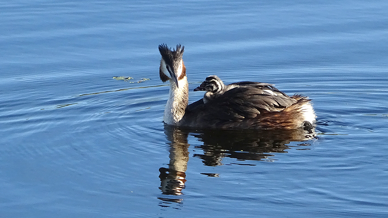 Gelukkig zien we ook weer het fuutje en met de camera deze keer dus een betere foto! Het beestje groeit als kool en is al echt zichtbaar op de rug van moeder.