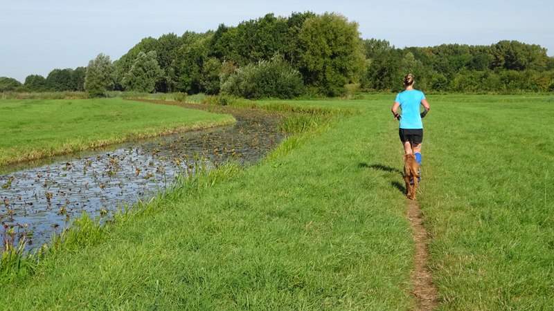 Gisteren heb ik niet gelopen want toen fietste ik naar mijn zusje in Leidschendam. Na ruim 80 km stond ik toen weer voor de deur. Was erg leuk en het weer was natuurlijk geweldig. Morgen ga ik de Gerrie Kneteman Classic rijden op de racefiets, gisteren natuurlijk op de Santos met woeffie in de doggyride. Vandaag dus een rondje lopen en het plan was om een langere run te doen. Afhankelijk van het weer en wat we allemaal gaan doen in de UK. Jammer genoeg was het eigenlijk een beetje te warm voor een mooie ronde door de polder want het is volkomen open daar. Bovendien moest S. eerst even naar de kapper dus zou ik alleen starten en zou S. met de doggyride en woef me achterop komen. Ik begon dus vol goede moed aan mijn rondje in mijn uppie met mijn (zware) rugzak met water en een petje. Het lopen ging op zich wel, ik had geen last van het fietsen van gisteren dus dat is prettig. Maar het was behoorlijk warm en ik wilde rustig lopen. Liever lang onderweg dan snelle kilometers.