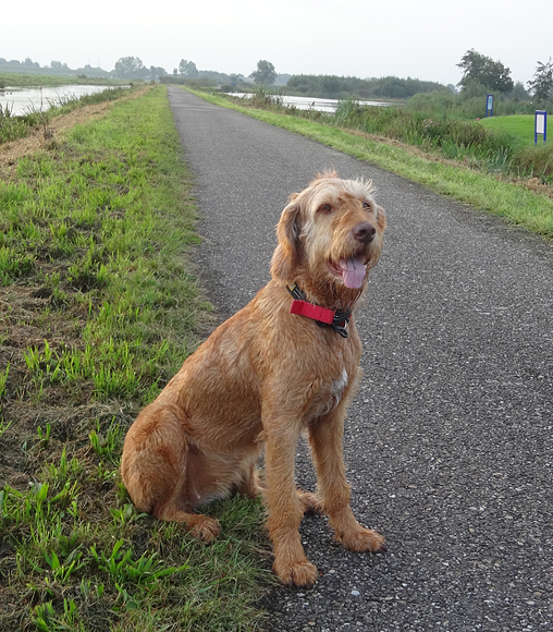Vanmorgen loop ik even snel een kort rondje om woef even goed uit te laten voordat we op de boot stappen. Dan heeft zij even lekker gerend en alles gedaan. Dat laatste was de laatste week een beetje lastig. Vaak slenterden we zinloos over het gras in de koelte en vermeden we reutjes maar poepte ze dus niet. Dat is vervelend op de boot dus vandaar toch maar even snel op pad. Alle renkleding was al ingepakt dus had ik een reserve setje gemaakt met wat oude dingen. Werkt ook prima natuurlijk. Al snel waren we op pad. Geen mooie zonsopkomst deze keer want het heeft geregend vannacht, het is afgekoeld en nu helemaal bewolkt. Dat is ook wel weer even lekker nu!