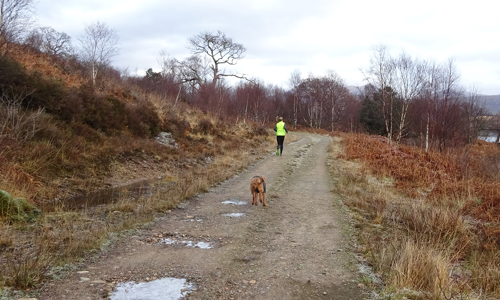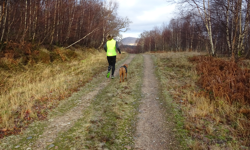 Na de open vlaktes lopen we het bos weer in. Ik herinner me nog de eerste paar keer dat ik hier was. Aanvankelijk liep ik alleen tot het hek vlak voor de bosrand. Dat vond ik toen al best ver en bovendien vond ik het heel eenzaam. Nu vind ik het prachtig en ben ik ook minder onder de indruk van het massieve ‘weidse’ om me heen. Het is overigens nog wel steeds indrukwekkend maar ik herinner me vooral de eerste keer dat ik er liep en me heel nietig voelde. Ik heb er ook vaak genoeg met ontzettend slecht weer gelopen overigens! Woef is een keer heel stijf geworden van een run in de ijsregen hier. Daarna hebben we voor haar toch maar die equafleece gekocht en sindsdien heeft ze nooit meer problemen met stijfheid of pijn na een natte run.
