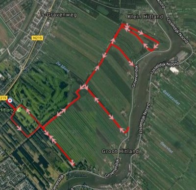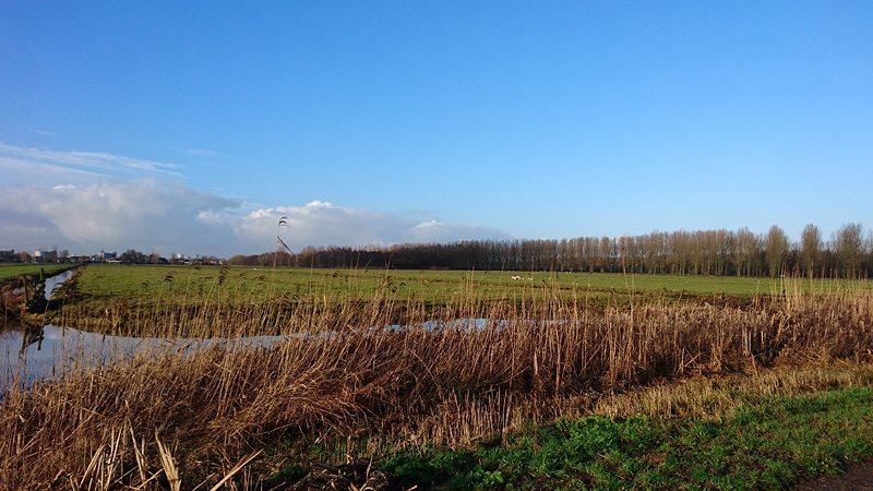 Ik loop deze keer wel weer eerst naar de dijk en ga daarna naar het andere gebied. Daar loop ik eerst weer op en neer naar de dijk en daarna loop ik tweemaal het offroad stukje langs de ooievaars. Het zonnetje is inmiddels gaan schijnen en ik heb al van alles uitgetrokken onderweg. Mijn handschoenen en sleeves zitten al in mijn zakken dus ik zie er uit als een zwangere dame met al die spullen in de zakken van mijn bodywarmer. Mijn mouwen heb ik helemaal opgetrokken zodat ik lekker met blote armen loop.
