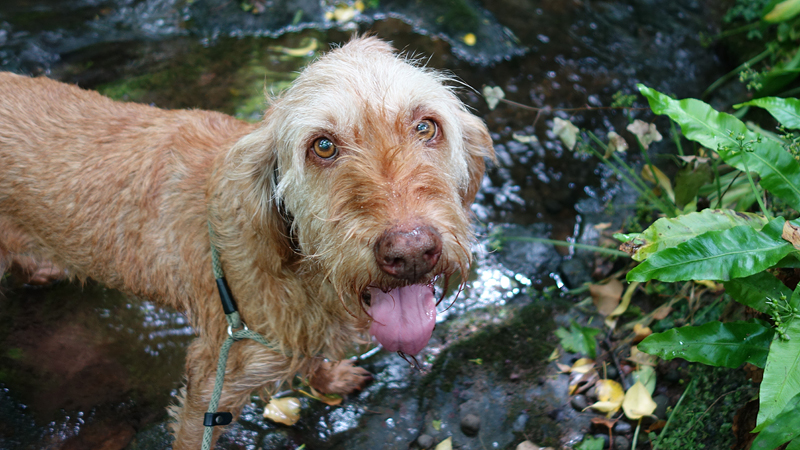 In het bos lijn ik woefje even aan bij het water omdat ze anders misschien achteruit lopend zo de waterval af klettert. Ik zit ongemakkelijk op de rand en hou haar bij me. Ze kijkt blij en vindt alles leuk.