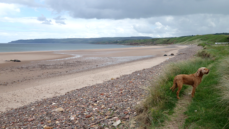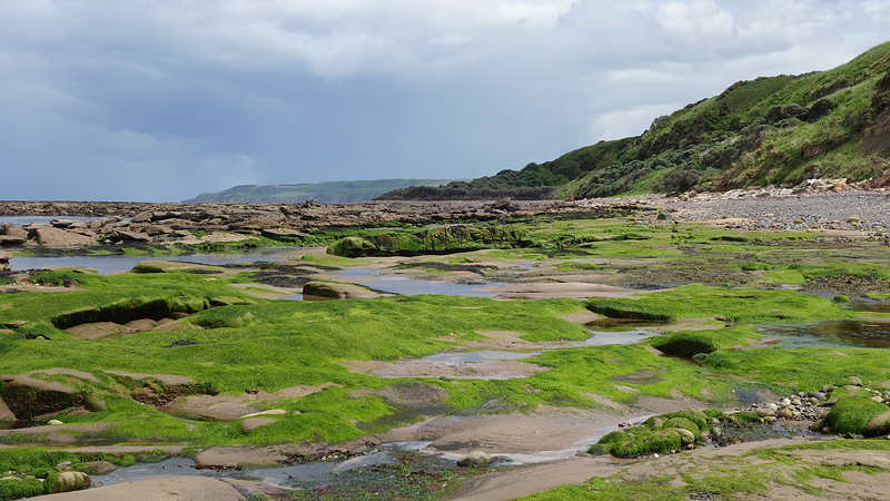 We gaan maar weer terug en lopen weer het heuveltje op naar Cove zelf en daarna even langs de weg om weer op het wandelpad richting het strandje te komen. Dat is inmiddels gesneden koek en het loopt heerlijk even omlaag. Vorig jaar schoot ik ook lekker op op de terugweg. Al snel lopen we weer het strand op zonder normale route.De lucht is inmiddels heel dreigend maar het buitje dat we net hadden vanaf Cove is alweer gestopt. Op het strand liggen grote keien. Hoe ze daar nou een pad overeen kunnen laten lopen is mij een raadsel. Het levert wel mooie plaatjes op.