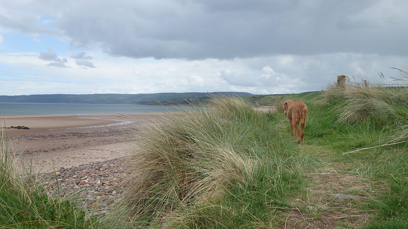 Het eerste stukje gaat over het strand en daarna lopen we op een smal en schuin stukje gras richting het eerste hekje en daarna gaan we even klimmen. Ik herken alles gelukkig dus dat is makkelijk.