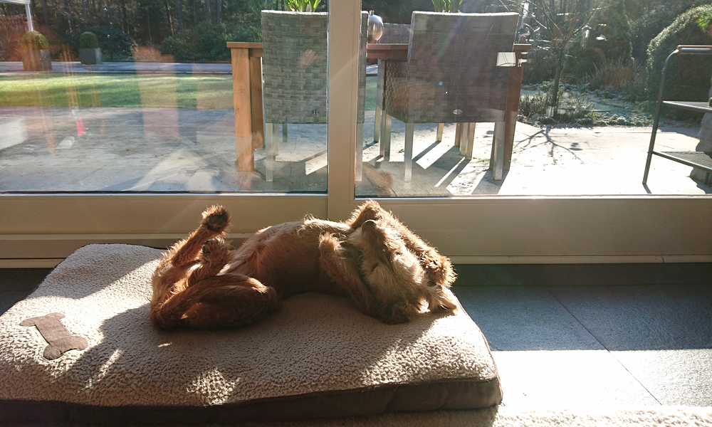 Gisteren liepen we een 8 km rondje, vandaag gaan we weer op pad. Het is stralend weer maar wel heel koud. Als ik opsta is het pas -3 dus ik wacht even. Ondertussen ligt woefje heerlijk voor het raam in de zon. Zij weet wel wat genieten is en ligt op haar rug met gestrekte pootjes te zonnen. Straks wil ze vast wel met me mee.