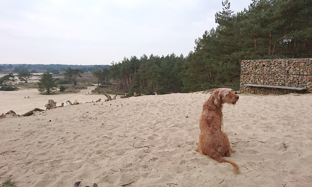 Aan het einde van het pad steek ik de snelweg over en loop naar de zandverstuiving. Woefje is hier weer netjes even aan de riem. Ik maak een kiekje en loop daarna langs het hek weer naar de Klarenweg. Helemaal aan het einde kom ik een dappere dame op en mountainbike tegen. Ik ga door de hekken, steek snelweg en spoor over en hobbel verder. Even over het stukje ‘eigen weg’ van iemand en daarna tussen de weilanden door. Er staan volop sneeuwklokjes.