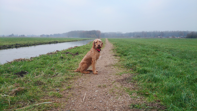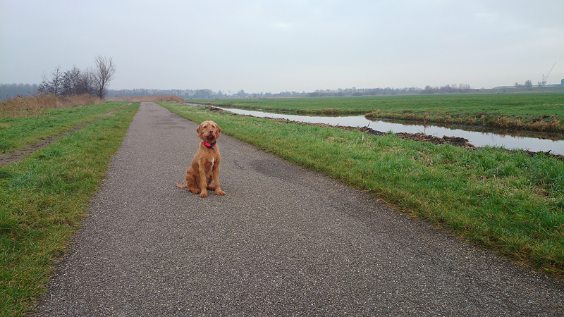 Vandaag op weg naar de Rottemeren voor mijn korte draafrondje maar toen ik langs Hitland reed, besloot ik toch maar gewoon over Hitland te lopen. Lekker dichtbij, scheelt bijna een uur op de hele training qua tijd. Zo gezegd zo gedaan. Ik had gisteren een jack gekocht van Falke, en dat kon ik vandaag dus mooi uitproberen want het was tamelijk fris. Daarbij lekker handschoentje bij de start en een nieuwe pet, ook van Falke. Geen rugzak, want ik had even geen zin om met bepakking te lopen. Normaal sleep ik dat altijd mee, omdat ik eraan moet wennen voor de ultra. Maar vandaag even niet. Wel de foon mee in mijn jackje, en zo kon ik dus aan het begin nog even snel een kiekje maken van woef.
